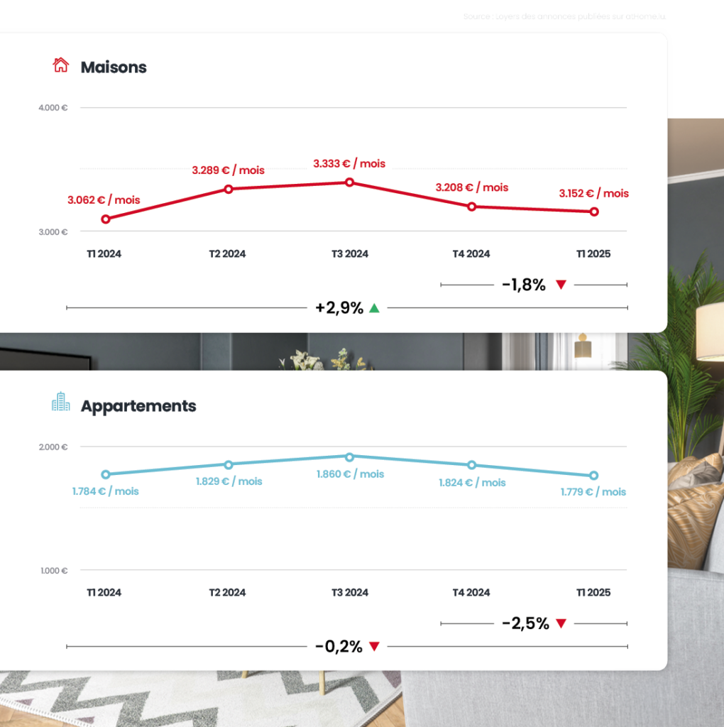 Die Rückgang der Mieten, die ab Ende 2024 eingeleitet wurde, wird sich bestätigt im ersten Quartal 2025. Die Mieten für Häuser verzeichnen eine Rückgang um -1,8% im Vergleich zum Vorquartal, während die Mieten für Wohnungen um -1,8% im Vergleich zum Vorquartal sanken. Rückzug stärker ab (-2,5%). Dieser Rückgang spiegelt einen Wiederherstellung des Gleichgewichts des Mietwohnungsmarktes, mit einem Angebot, das passt sich an nach einer Phase der Anspannung allmählich der Nachfrage. Im Durchschnitt liegt die Miete für eine Wohnung in Luxemburg bei 1.779 €/Monat, während die Miete für ein Haus 3.152 €/Monat erreicht.