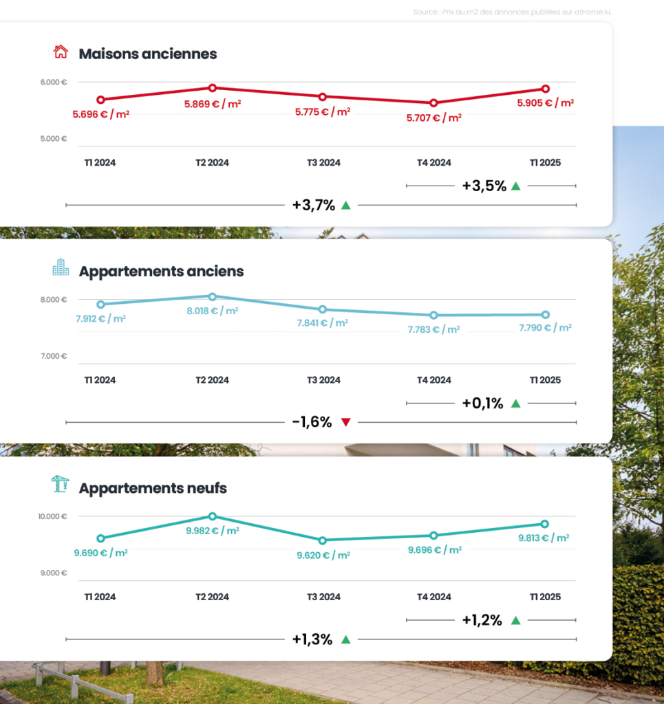 Nach einer Phase von StabilisierungDie Preise für alte Häuser stiegen in den letzten Jahren um Anstieg um +3,5% im Vergleich zum Vorquartal, was ein erneutes Interesse an diesem Segment bestätigt. Der Markt für Altbauwohnungen bleibt insgesamt stabil (+0,11TP3Q), während neue Wohnungen weiterhin ein Aufwärtstrend (+1,2%). Diese Dynamiken müssen in den nächsten Monaten beobachtet werden, um ihre Auswirkungen auf den Arbeitsmarkt zu beurteilen. Nachhaltigkeit. Der durchschnittliche Preis für ein altes Haus in Luxemburg über alle Wohnflächen hinweg liegt bei 5.905 €/m² und der Preis für eine alte Wohnung bei 7.790 €/m².