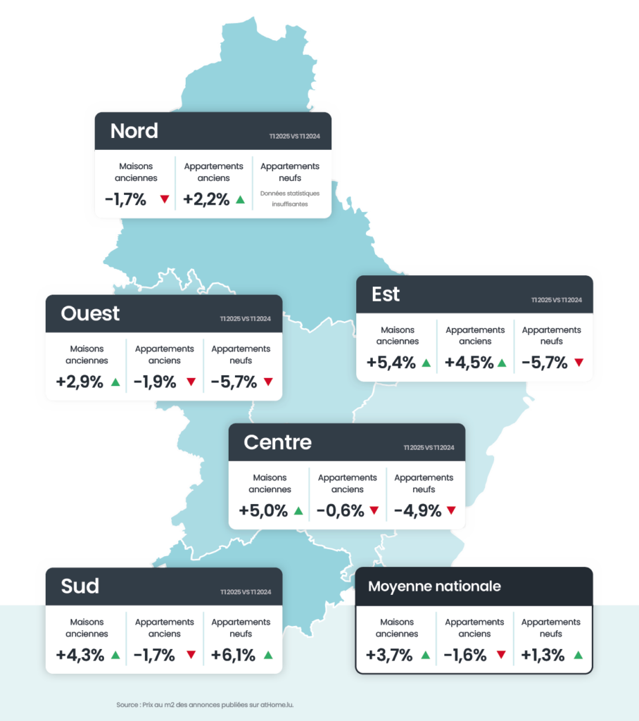 Innerhalb eines Jahres stiegen die Preise für alte Häuser erhöht in mehreren Gebieten, vor allem im Osten, in der Mitte und im Süden, wo die Anfrage bleibt stark. Im Gegensatz dazu verzeichnen die Preise für Altbauwohnungen von leichte RückgängeDie meisten Menschen waren in der Lage, sich zu bewegen, außer im Osten und Norden, wo eine Erhöhung festgestellt wird. In Bezug auf neue Wohnungen weist der Markt uneinheitliche Entwicklungen : die Preise nehmen ab im ganzen Land deutlich, außer im Süden, der eine stärkere Dynamik aufweist. stabil. Diese Trends spiegeln einen Neuanpassung des Marktes und eine erhöhter Druck auf alte Häuser, was die Rückkehr der Käufer für diese Art von Immobilien widerspiegelt.