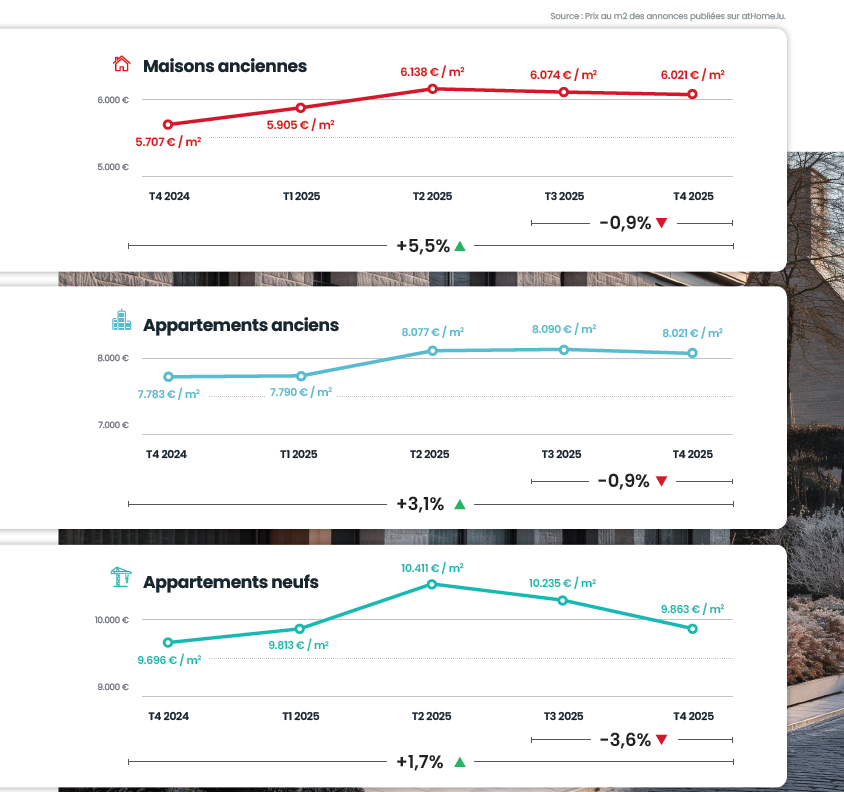 The fourth quarter of 2025 saw a continuation of the dynamic trends seen throughout the year, with the Luxembourg property market in a phase of stabilisation. Sales prices remain steady overall, with a slight fall for new flats, which remain attractive thanks to their quality and modernity. The rental sector, meanwhile, remains broadly balanced, with relatively constant short-term trends, testifying to lasting market stability and sustained demand.