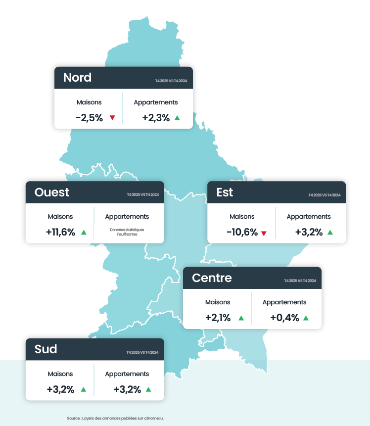 Rents for houses rose sharply in the West (+11.6 %), while they fell in the North (-2.5 %) and more sharply in the East (-10.6 %). For flats, the changes were more moderate, with increases seen particularly in the North (+2.3 %), the Centre (+0.4 %) and the South (+3.2 %). These variations reflect different dynamics according to region and property type, in a rental market that remains balanced overall.