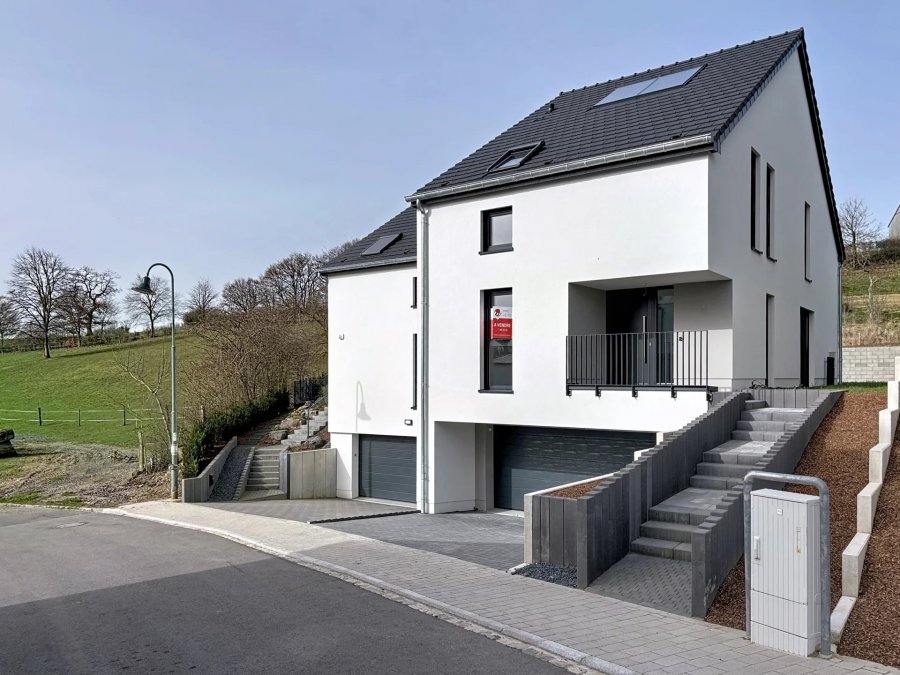 In Zusammenarbeit mit der Baufirma Wiesen-Piront präsentieren wir Ihnen diese hochwertige, vollständig fertiggestellte Doppelhaushälfte in Kalborn, einem idyllischen Ortsteil der Gemeinde Clervaux. Das Haus (Los 3) befindet sich auf einem 3,92 Ar großen Grundstück und bietet eine Wohnfläche von ca. 142 m². Die durchdachte Architektur und die moderne Raumaufteilung schaffen ein komfortables und familienfreundliches Wohnambiente. Im Untergeschoss befinden sich eine Waschküche, ein Technikraum sowie eine großzügige Garage mit Platz für zwei Fahrzeuge. Das Erdgeschoss empfängt Sie mit einer einladenden Eingangshalle, die in eine offene Küche mit angrenzendem, lichtdurchflutetem Wohn- und Essbereich von über 51 m² führt. Von hier aus gelangen Sie direkt auf die Terrasse und in den Garten. Ein Büro sowie ein separates WC runden diese Etage ab. Im Obergeschoss stehen drei geräumige Schlafzimmer zur Verfügung, darunter eine Elternsuite mit Ankleidebereich und eigenem Duschbad. Zusätzlich befinden sich auf dieser Ebene ein weiteres Badezimmer mit Badewanne und italienischer Dusche sowie ein separates WC. Das Dachgeschoss bietet einen über eine Ausziehtreppe zugänglichen Speicher und schafft zusätzlichen Stauraum. Technisch überzeugt die Immobilie durch weiße PVC-Fenster mit Dreifachverglasung, elektrische Rollläden in den Schlafzimmern, klassischen Innenputz, eine Gas-Brennwertheizung mit Fußbodenheizung sowie Solarpaneele zur Unterstützung der Warmwasserbereitung und Heizung. Hochwertige Bodenbeläge mit Fliesen (Budget 40 € / m² inkl. MwSt.) sowie 15 mm starkes Mehrschichtparkett in den Schlafzimmern und im Ankleidebereich unterstreichen den gehobenen Ausstattungsstandard. Die ruhige Lage verbindet naturnahes Wohnen mit optimaler Infrastruktur. Die N7 ermöglicht eine schnelle Anbindung nach Diekirch und in die Stadt Luxembourg. Einkaufsmöglichkeiten, Banken, Restaurants und Apotheken befinden sich in unmittelbarer Nähe. In Clervaux stehen unter anderem das Lycée Edward Steichen sowie eine anerkannte Europaschule zur Verfügung. Zudem bietet der Bahnhof in Clervaux direkte Zugverbindungen nach Ettelbrück und Luxemburg-Stadt. Kaufpreis: 1.080.000 € Die Mehrwertsteuer ist rückerstattbar.