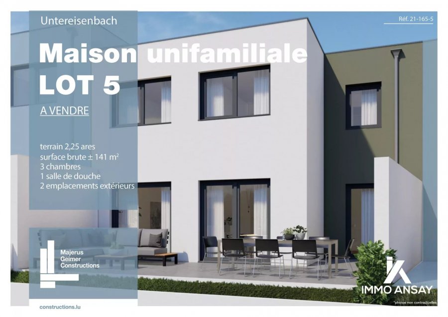 Single family house (lot 05) in strip, future construction, with a living space of 141 sqm, on a land of 2.25 ares, consisting of on the garden floor: hall (4 sqm), living room with kitchen (43 sqm) and access to the terrace (35 sqm), utility room / laundry room (15 sqm), separate WC (2 sqm), storage room (8 sqm) Ground floor: entrance area (11 sqm), bedroom with dressing room (20 sqm) + 2 bedrooms (14+ 15 sqm), shower room (7 sqm), storage room (2 sqm) garden outdoor space: 2 Price of the project (land + construction and terrace: 710.097,48 VAT included (3%) the construction will be realized by MAJERUS-GEIMER CONSTRUCTIONS SARL 1 terrace INCLUDED in the offer (surroundings) EXCLUDED from the price are: interior painting, kitchen durable construction with insulating bricks in Poroton, with a remarkable thermal and acoustic capacity, triple glazed windows in PVC, flat roof, underfloor heating, ind. controlled mechanical ventilation, durable and high quality finishes, floor coverings and internal finishes that can be customised, high standard bathroom (equipped with furniture and walk-in shower) please visit our website www.immoansay.lu