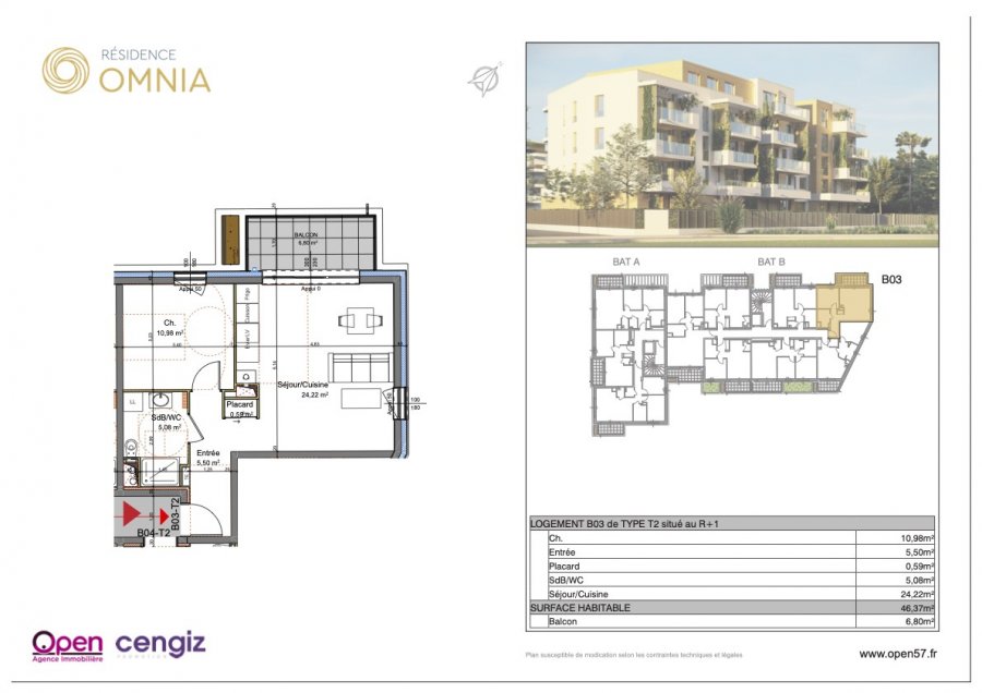 Appartement F2 - 46,37 m2 - 205 000,EUR. Découvrez le lot B3 de la Résidence OMNIA à THIONVILLE : un appartement de 46,37m2 de type F2 situé au r+1, avec un espace extérieur de 6,80 m2 proposé au prix de 205 000,EUR. Les prestations de cet appartement sauront répondre à vos exigences de confort et de qualité. Profitez d'un chauffage au sol au gaz, assurant une chaleur douce et homogène pour un bien-être optimal en toute saison. Les finitions soignées -- carrelage élégant, matériaux sélectionnés avec exigence -- apportent une véritable touche de raffinement à votre intérieur. Et pour que votre futur chez-vous vous ressemble vraiment, vous avez la possibilité de personnaliser certains aménagements selon vos goûts et vos envies. Cet appartement bénéficie d'un emplacement privilégié, à seulement quelques minutes des axes autoroutiers et de la frontière luxembourgeoise, facilitant ainsi vos trajets quotidiens. Idéalement situé, il se trouve à proximité immédiate de toutes les commodités (commerces, écoles, services...) et du centre-ville de Thionville, accessible à pied. Un cadre de vie pratique, paisible et parfaitement connecté. La Résidence OMNIA se compose de 37 appartements contemporains, du F2 au F4, à partir de 175 000 EUR. Chaque logement offre un espace extérieur privatif parfait pour profiter des beaux jours. Pour en savoir plus, contactez-nous au 03 82 54 73 56Ou par e-mail : contact@open57.fr OPEN IMMOBILIER 20, Allée du Château de Gassion, 57100 Thionville